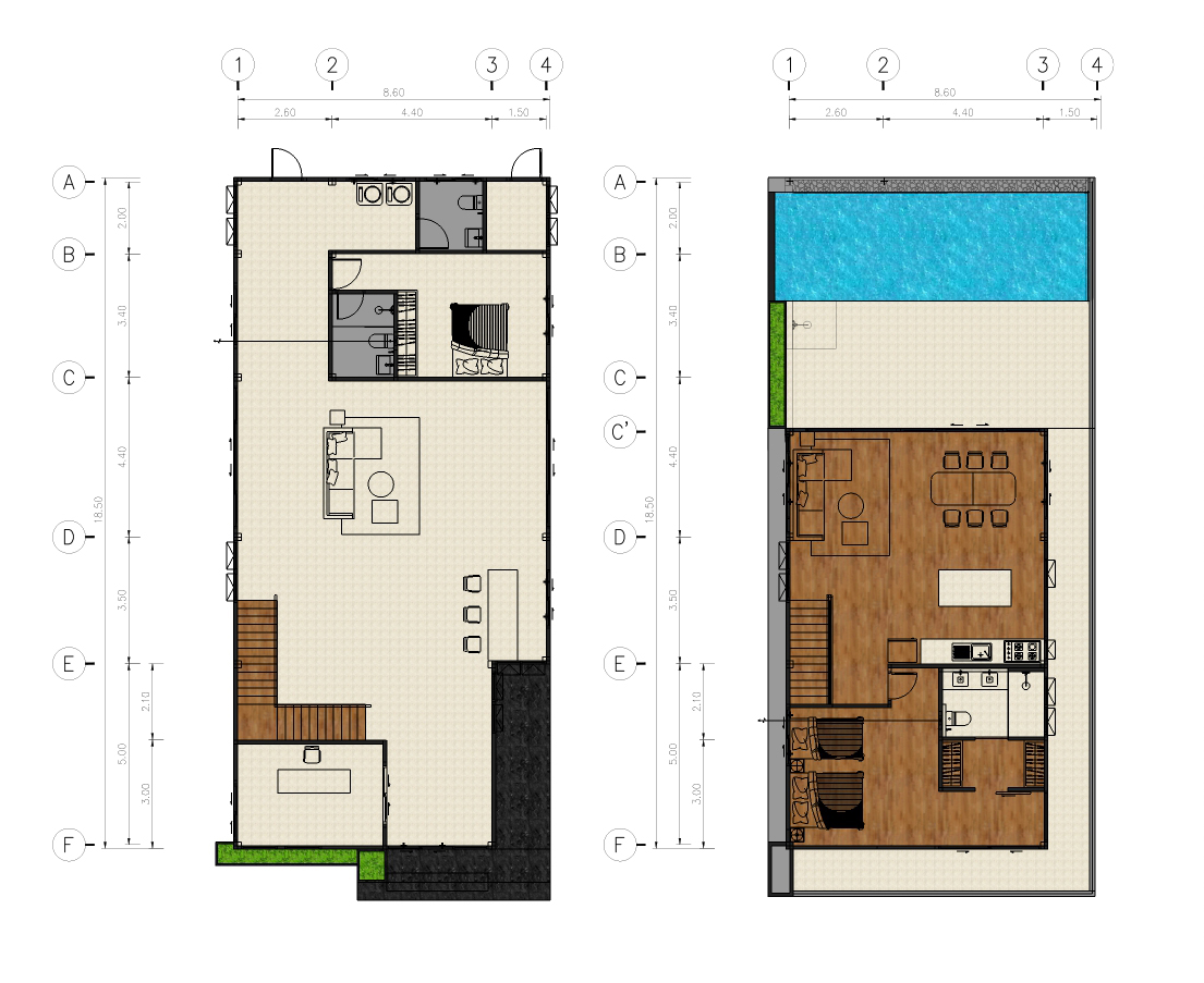 แบบบ้าน 2 ชั้น สไตล์ โมเดิร์น พร้อมสระว่ายน้ำ / สำหรับที่ดินขนาด กว้าง 13 x 23.5 เมตร ขึ้นไป